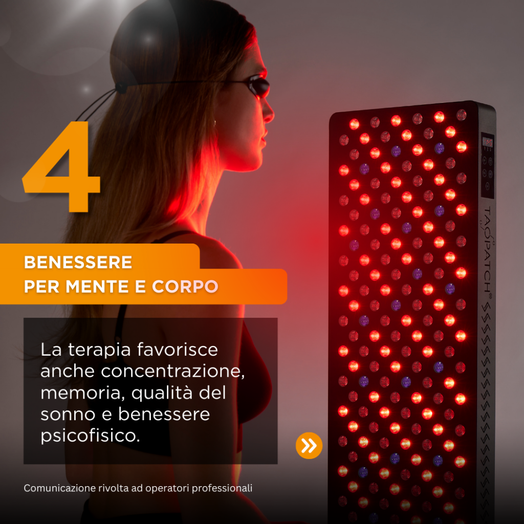 La Taopatch® BODY STATION del Centro Kines a Castano Primo agisce su molteplici aspetti del benessere con risultati rapidi e duraturi. È indicata per il sollievo dal mal di schiena, dolori articolari, artrosi, fibromialgia, tensioni muscolari e infiammazioni croniche. Può offrire supporto in presenza di lesioni nervose favorendo una migliore risposta cellulare. L’azione anti aging aiuta a ridurre rughe e piccole imperfezioni migliorando tono ed elasticità cutanea. La luce sostiene il trattamento di rossori, macchie dell’età e cicatrici da acne. È utile anche come supporto in caso di rosacea, eczema, psoriasi e altre problematiche cutanee. Oltre agli effetti locali, aumenta l’energia quotidiana, migliora concentrazione e memoria e favorisce un sonno più riposante. Presso il Centro Kines a Castano Primo la terapia luminosa diventa un alleato per il benessere emotivo e per una vitalità più stabile nel tempo.